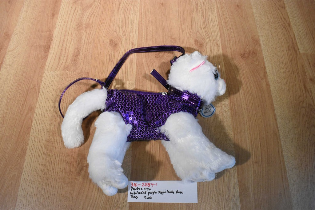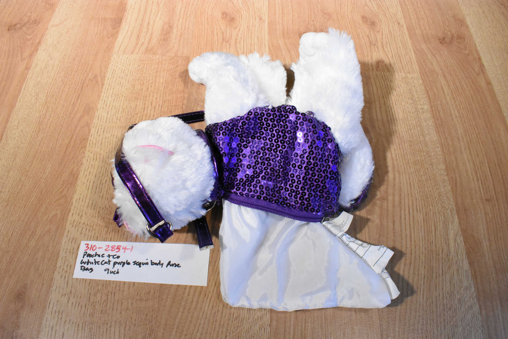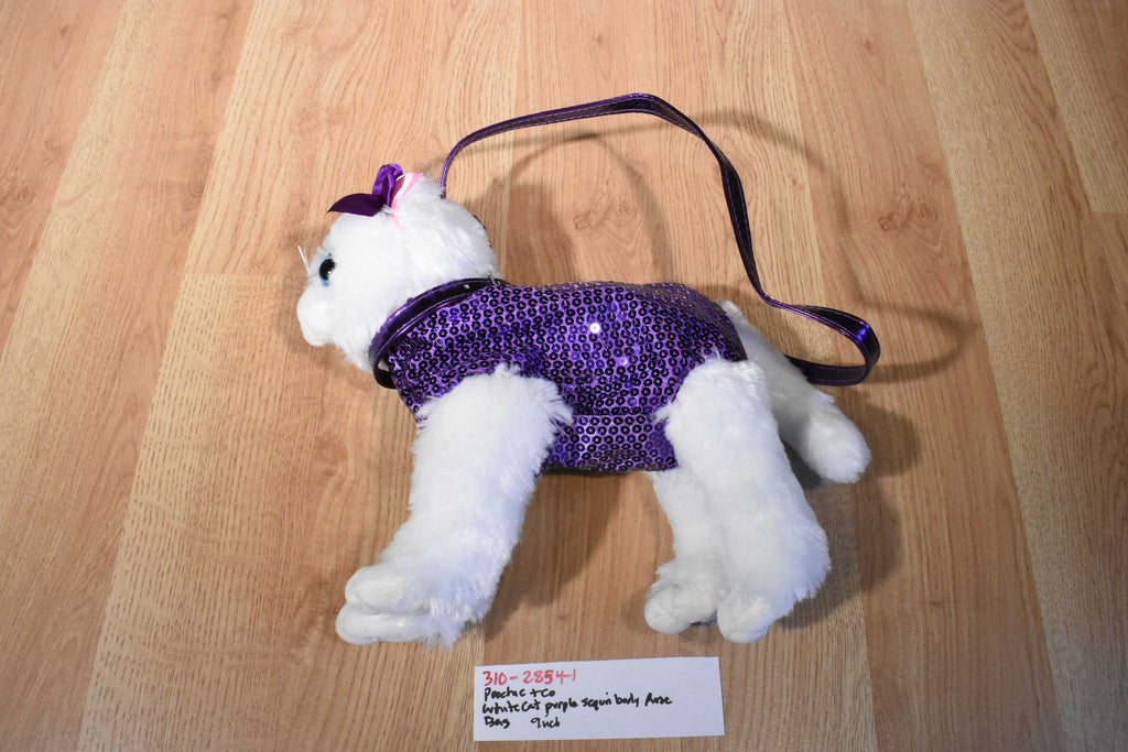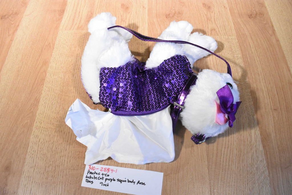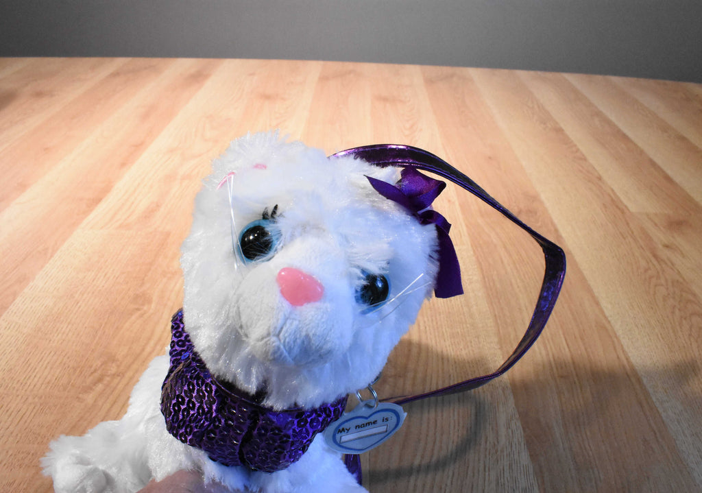 A fuzzy white Poochie & Co cat purse with a purple sequin body wearing a purple bow and collar.