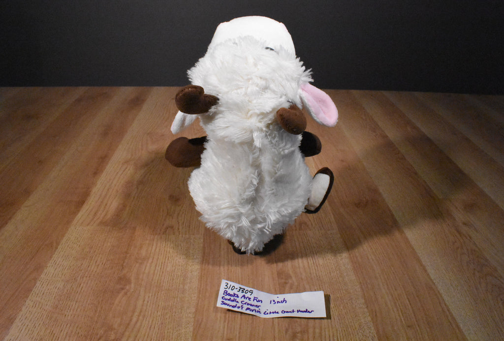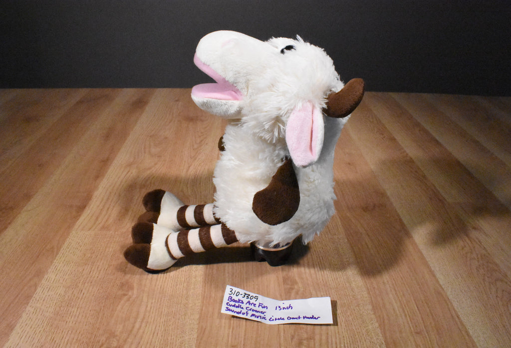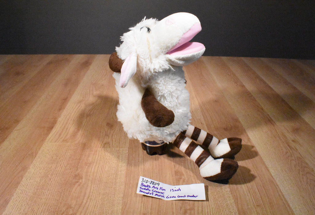 A white and brown singing goat puppet.