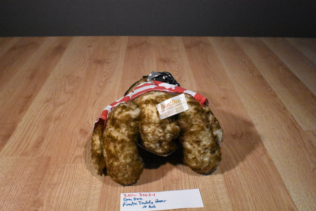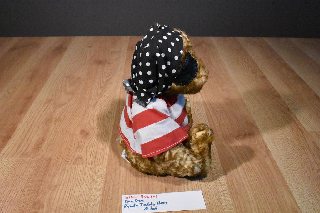 A sitting brown Dan Dee teddy bear wearing a red and white striped shirt, a black eye patch, and a blue and white polka-dot bandana.