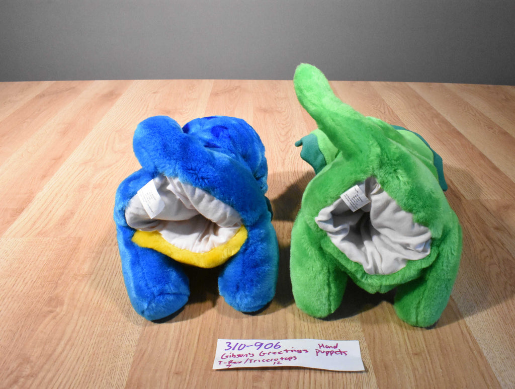 Two Gibson Greetings dinosaur puppets. A green Triceratops and a blue Brachiosaurus.