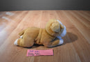 A laying, tan and white Miyoni Old English Bulldog puppy beanbag plush.