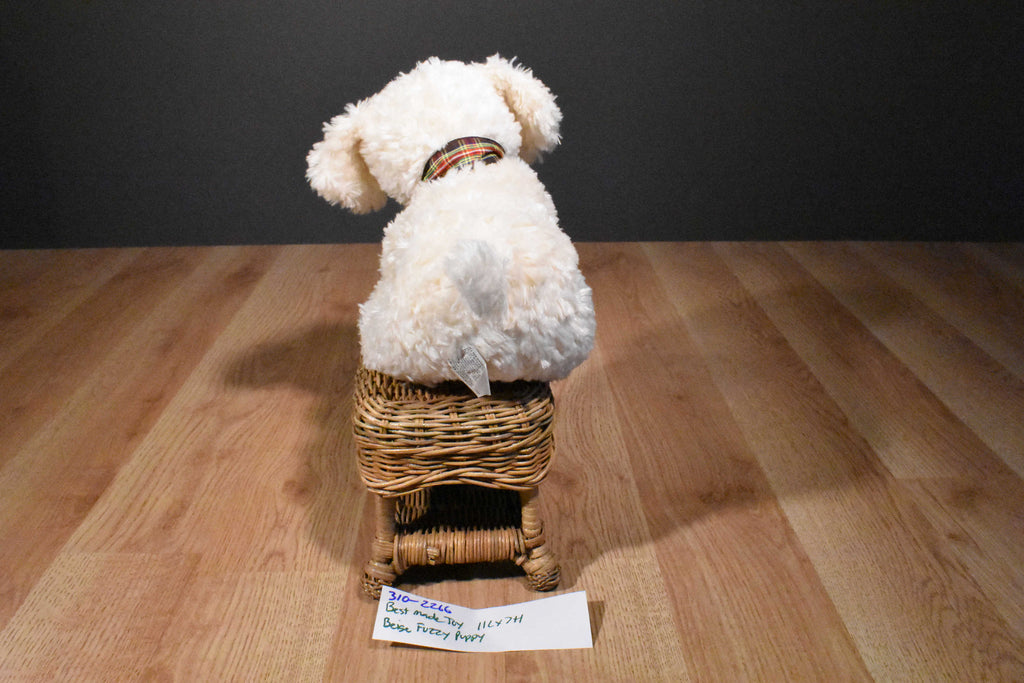 A fuzzy beige Best Made puppy with a red plaid bow.