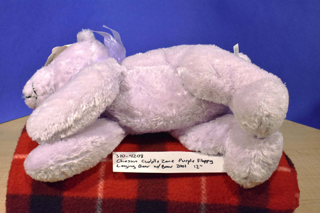 A laying floppy purple Chosun bear wearing a purple bow.