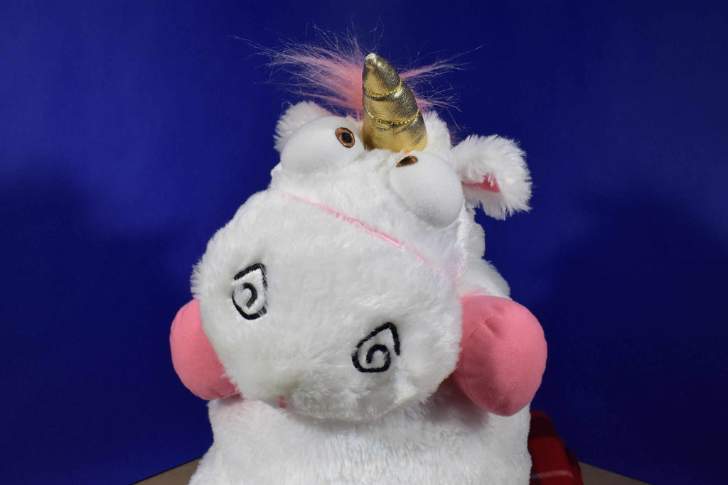 A fluffy white Despicable Me unicorn with pink mane and hooves and silly eyes.