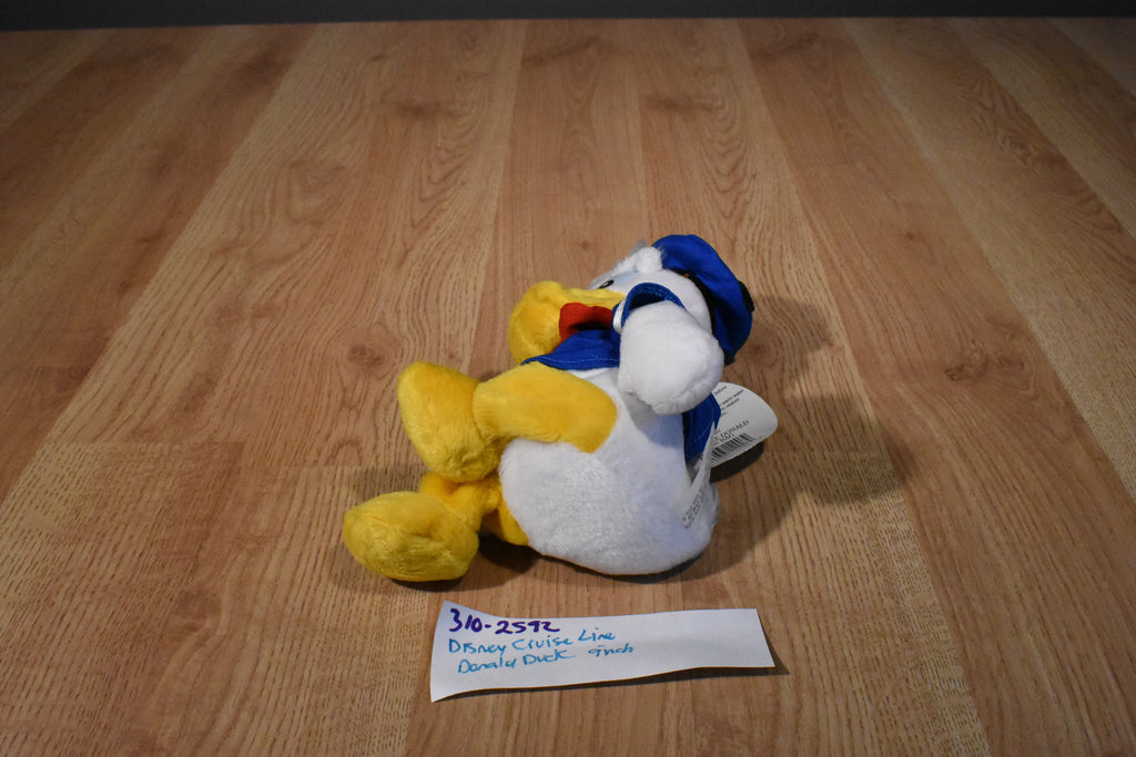 A white and yellow Disney Donald Duck wearing a blue sailor suit and hat and red bow tie.