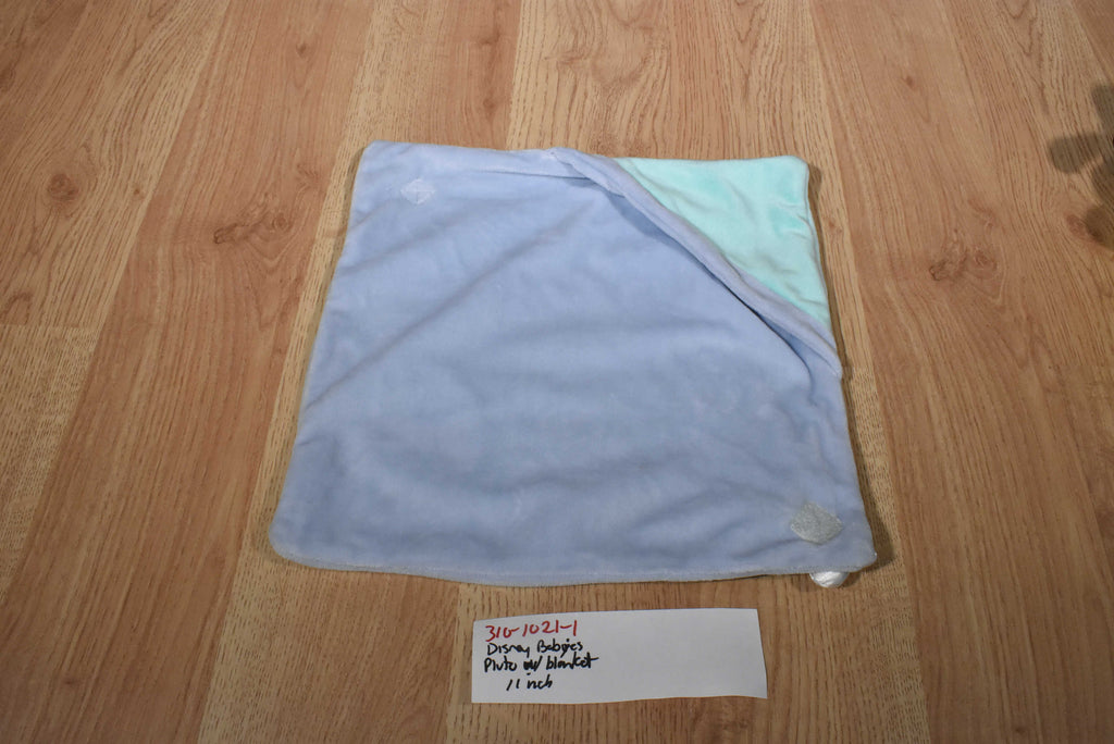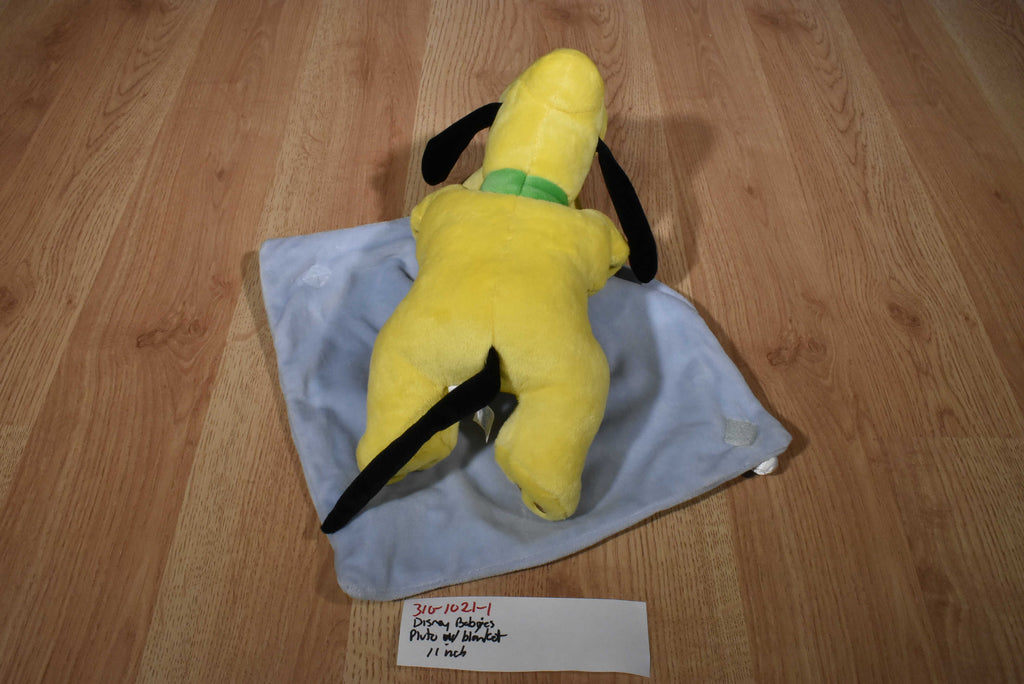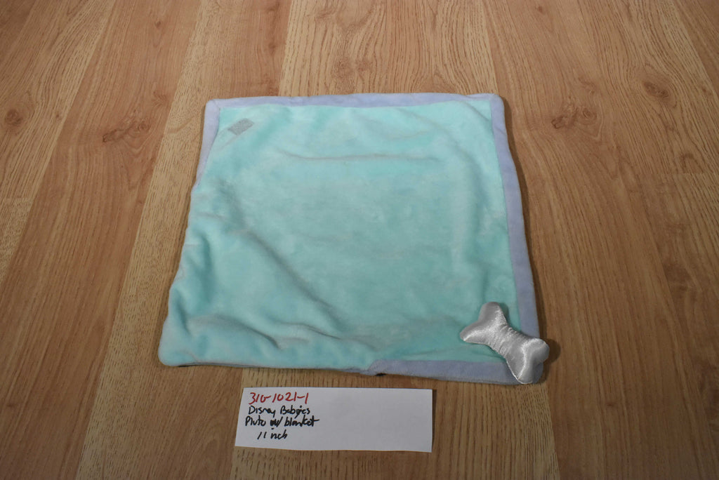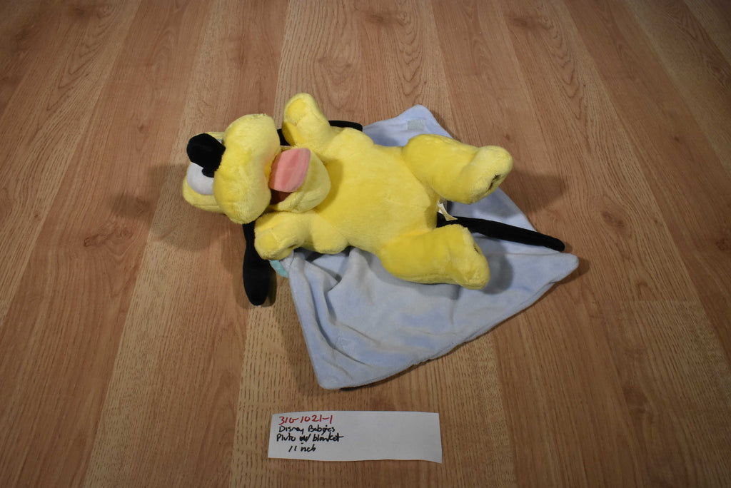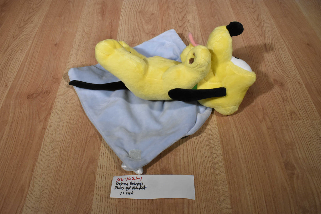 A yellow Disney baby Pluto wrapped in a green and blue blanket with a white bone tie.