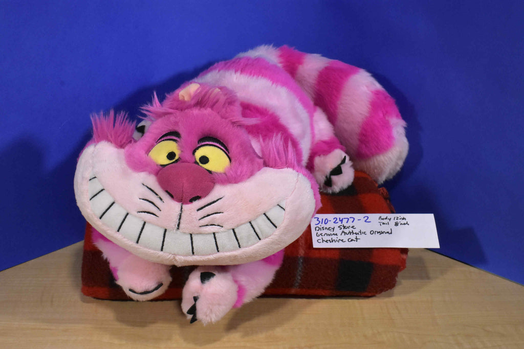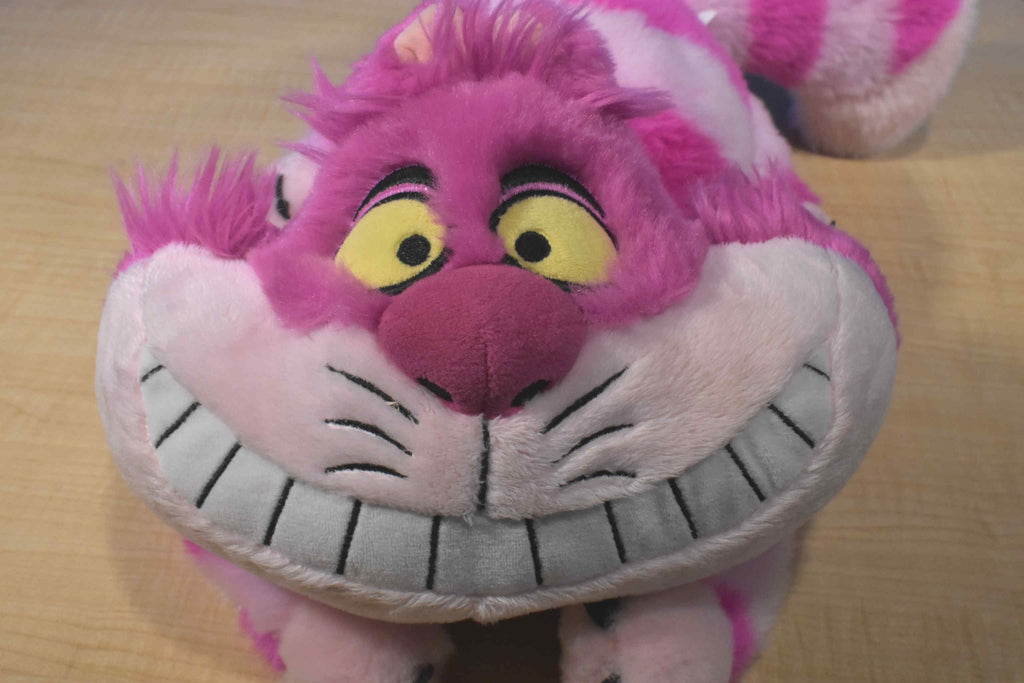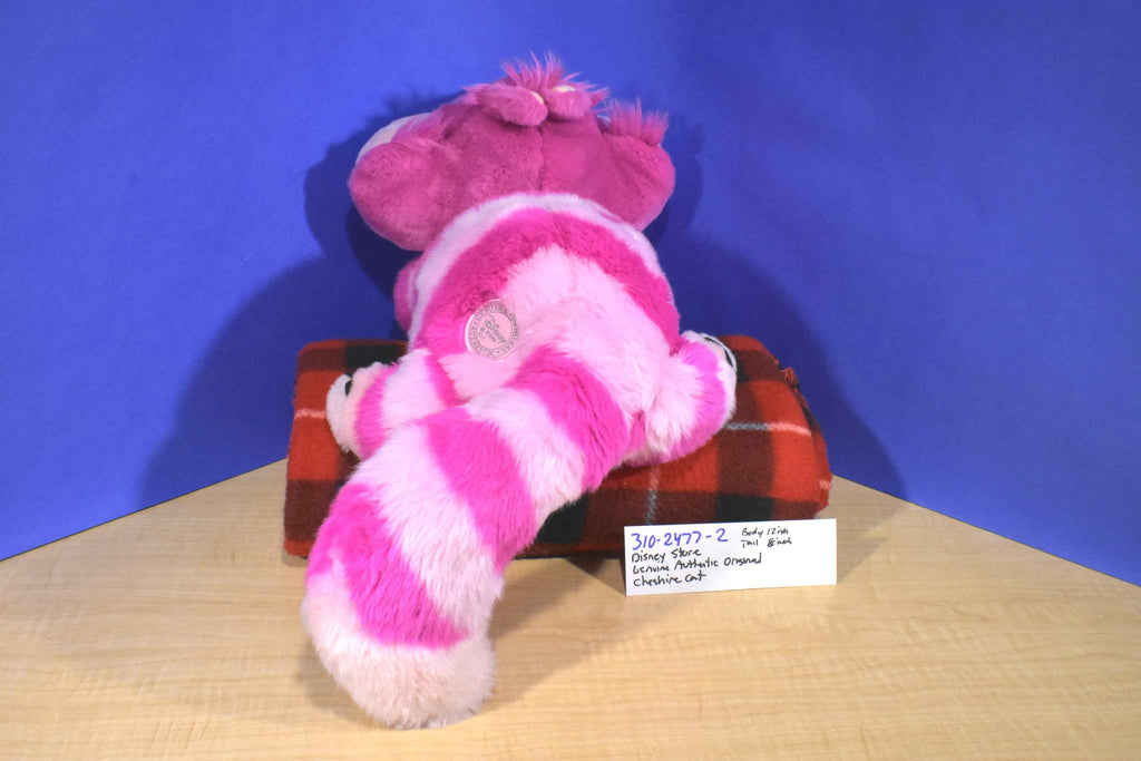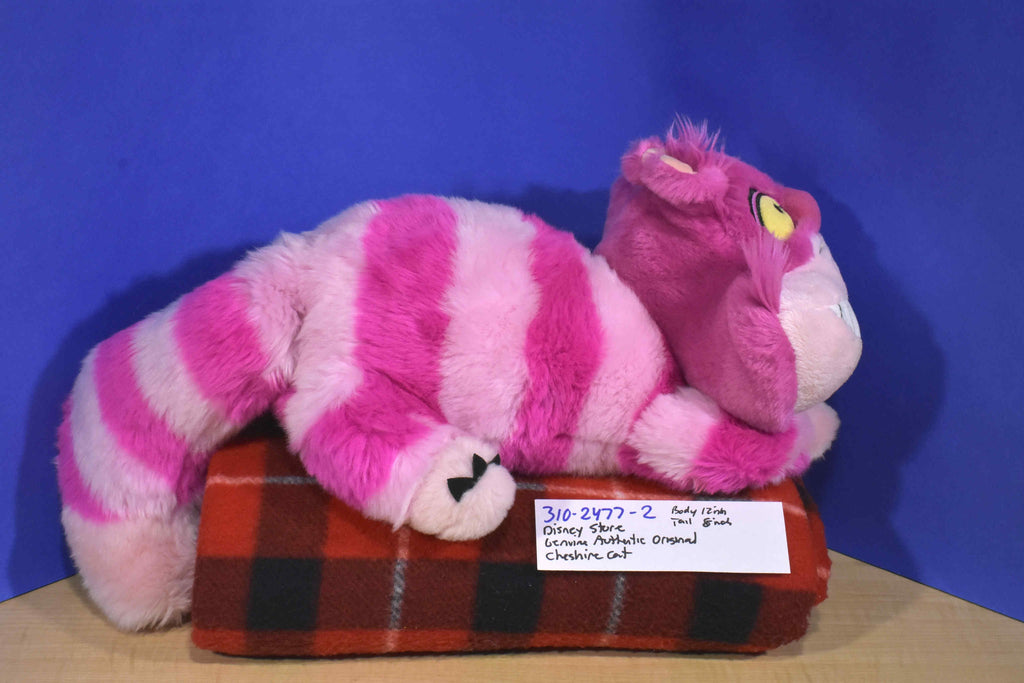 A laying pink and purple striped Disney Store Cheshire cat from the movie Alice in Wonderland.