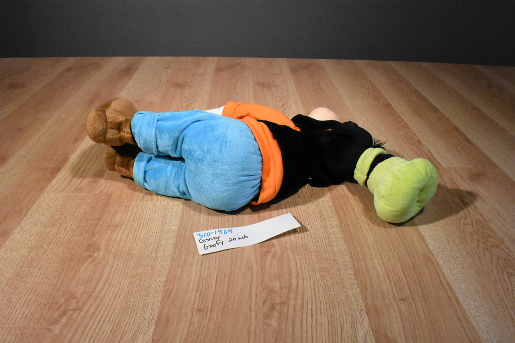 A floppy Disney Goofy dog wearing an orange shirt with a black vest, a green hat, and blue pants.