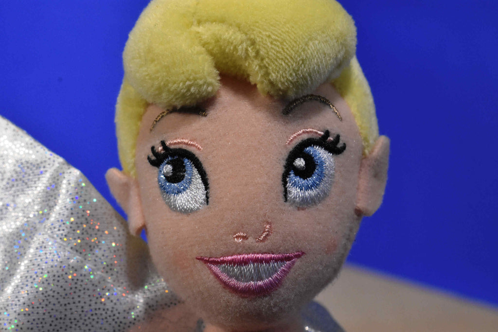 A Disney fairy Tinkerbell wearing a green dress and silver wings.
