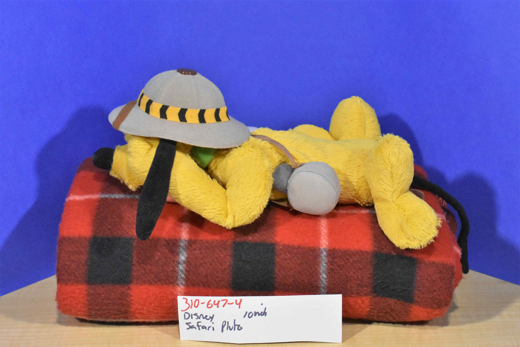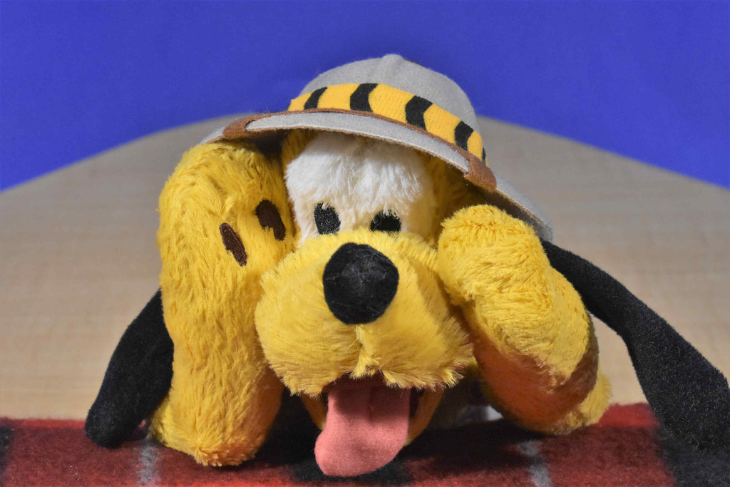 A laying yellow Disney Pluto dog wearing a beige safari hat and water container.
