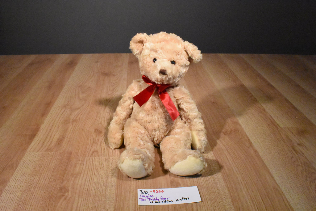A beige Douglas Teddy Bear named Callie wearing a red bow.