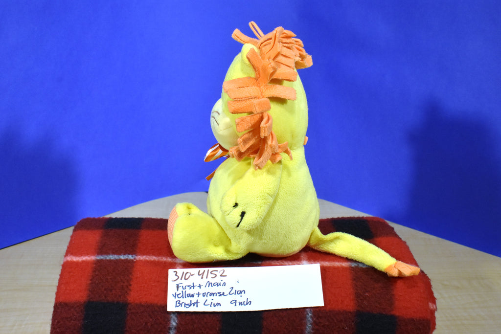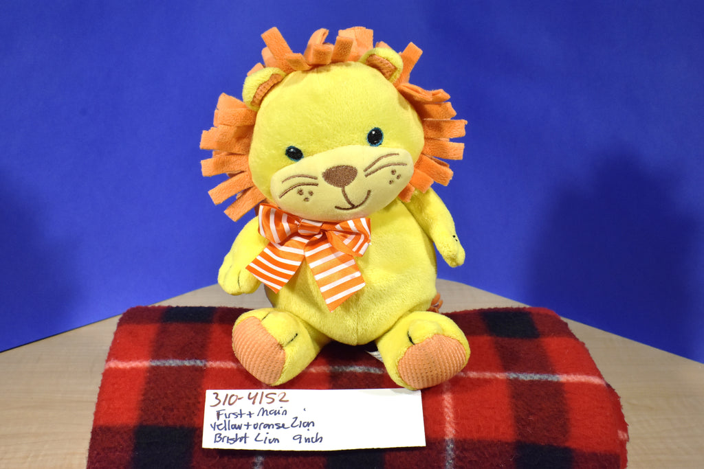 A yellow and orange First & Main male lion wearing an orange striped bow.
