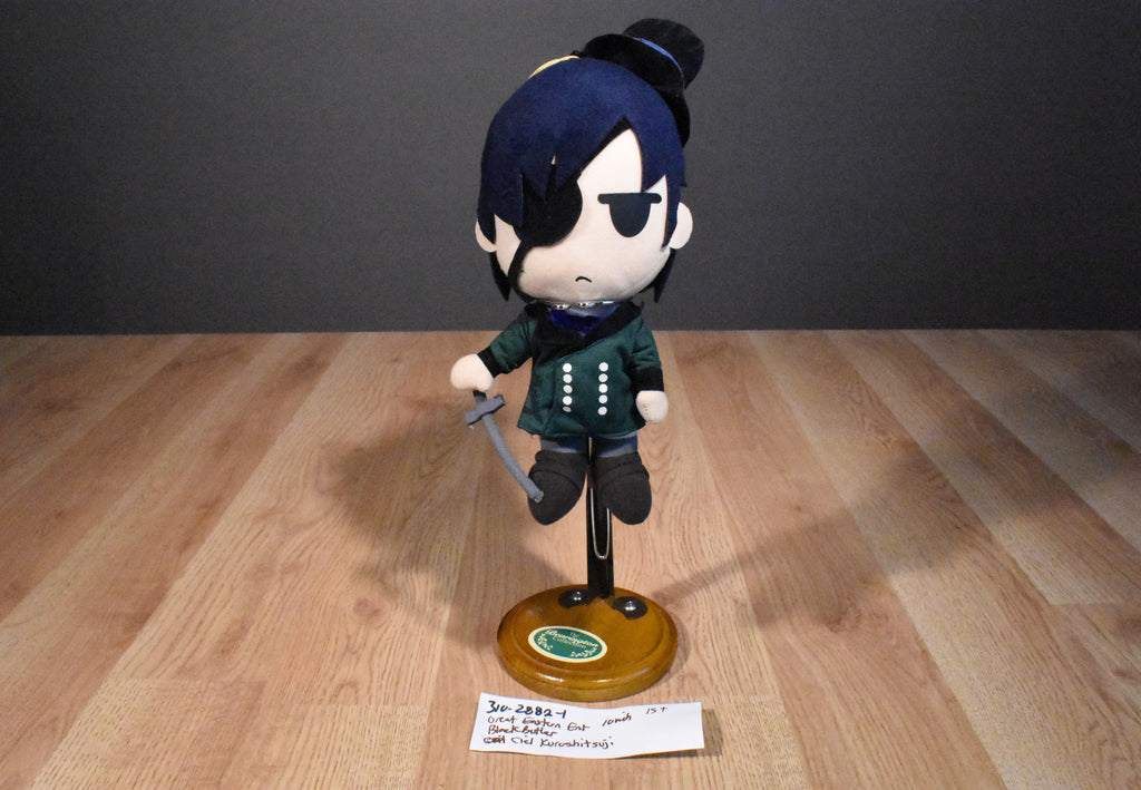 A Great Eastern Entertainment Ciel Kuroshitsuji boy wearing a black coat, top hat, and eye patch, and holding a grey sword, from the anime The Black Butler.