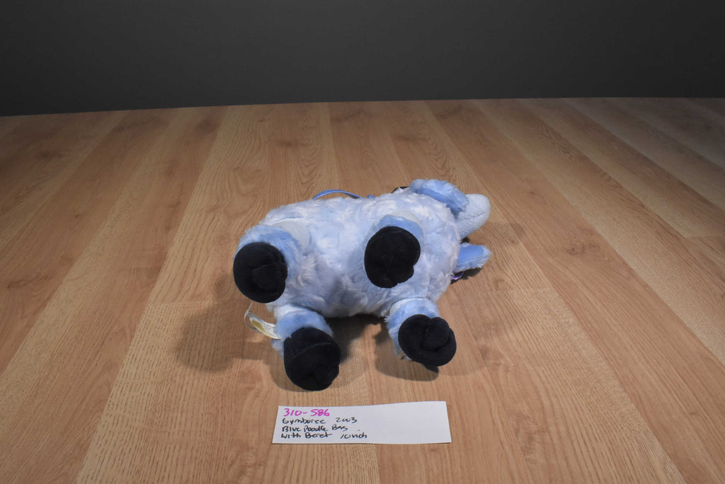 A blue Gymboree stuffed poodle puppy purse wearing a purple scarf and black beret.