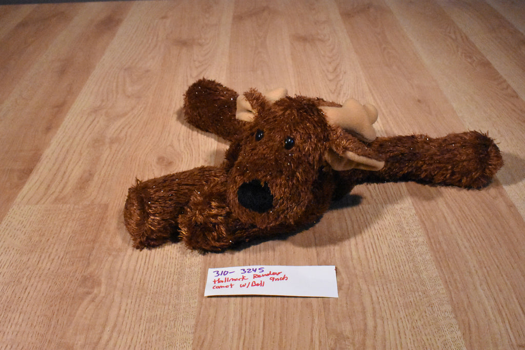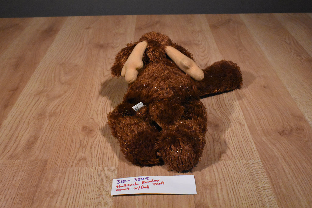 A floppy brown Hallmark reindeer named Comet wearing a red collar with a bell.