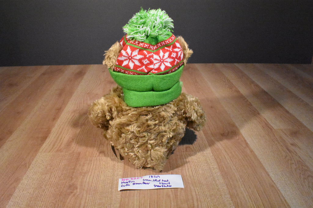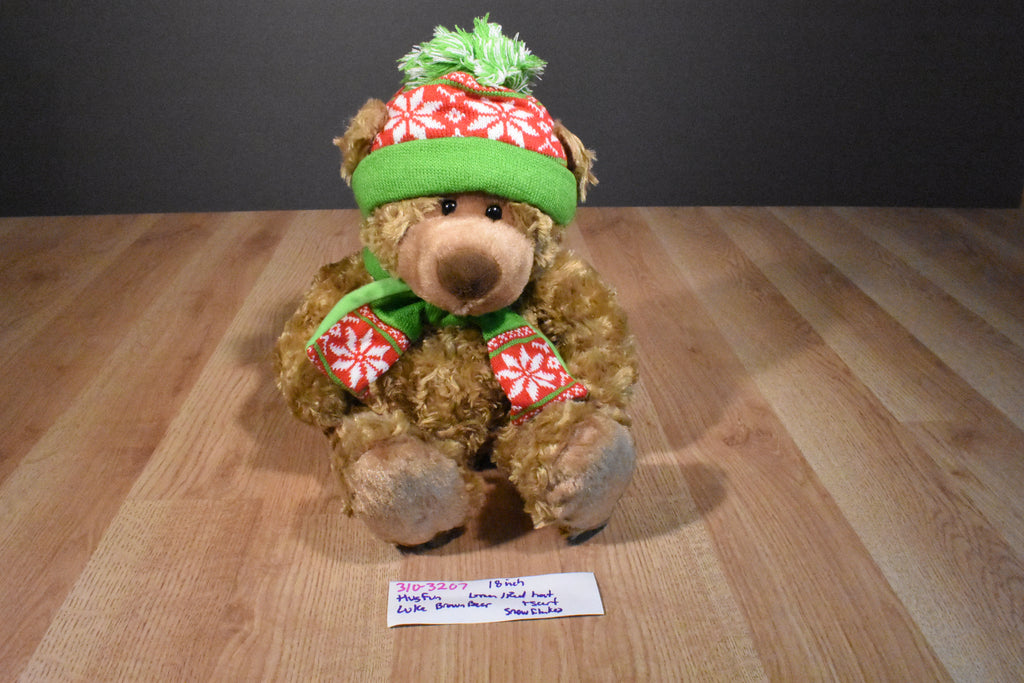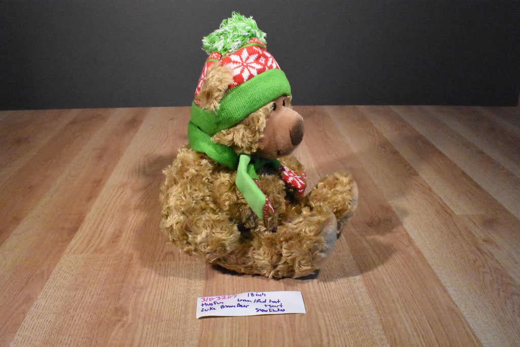 A brown Hugfun teddy bear named Luke wearing a Knit green and red snowflake hat and scarf.
