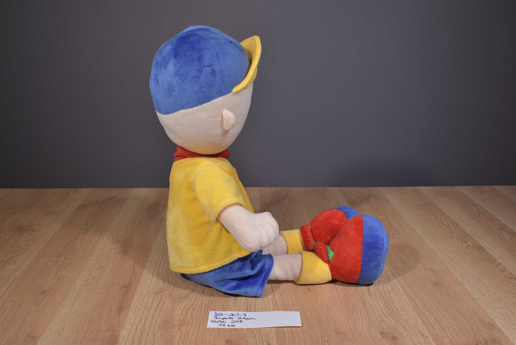 A Imports Dragon little boy named Caillou wearing a yellow and red shirt, blue shorts, red and blue shoes, and a blue and yellow baseball cap.