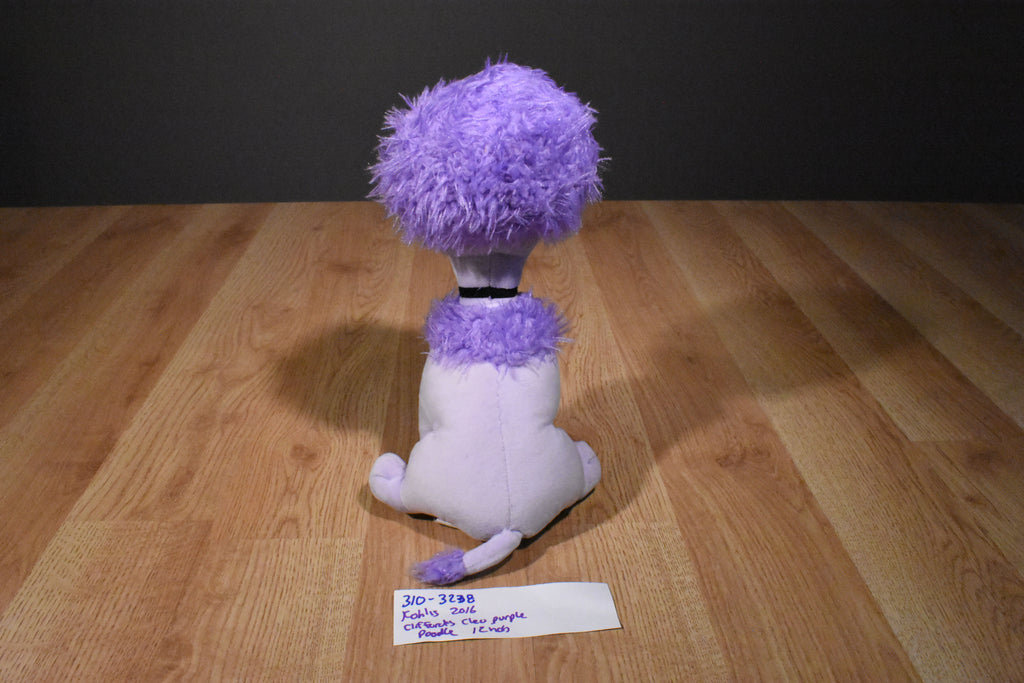 A sitting purple Kohl's Cares Clifford poodle puppy named Cleo wearing a pink bow.