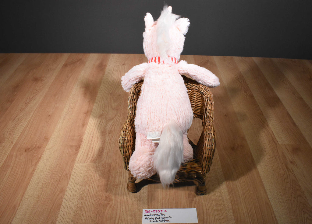 A pink Manhattan Toy unicorn with red and white striped scarf.