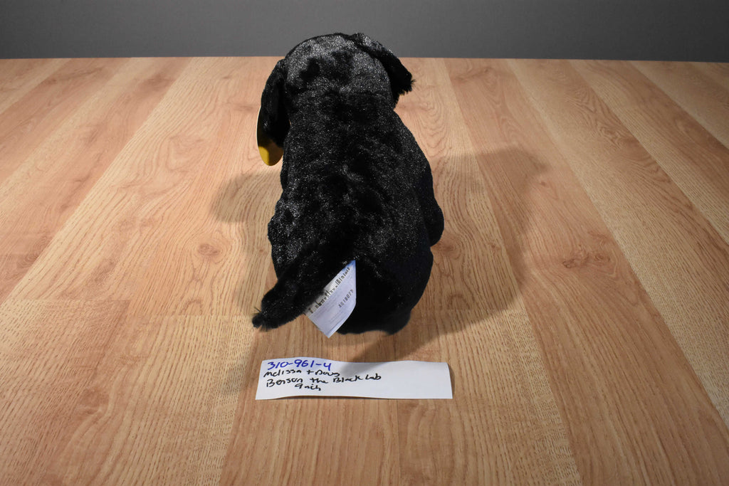 A floppy Melissa & Doug black Labrador puppy dog named Benson.