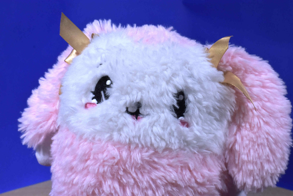 A pink and white Pikmi Pops poodle puppy named Truffle wearing gold bows.