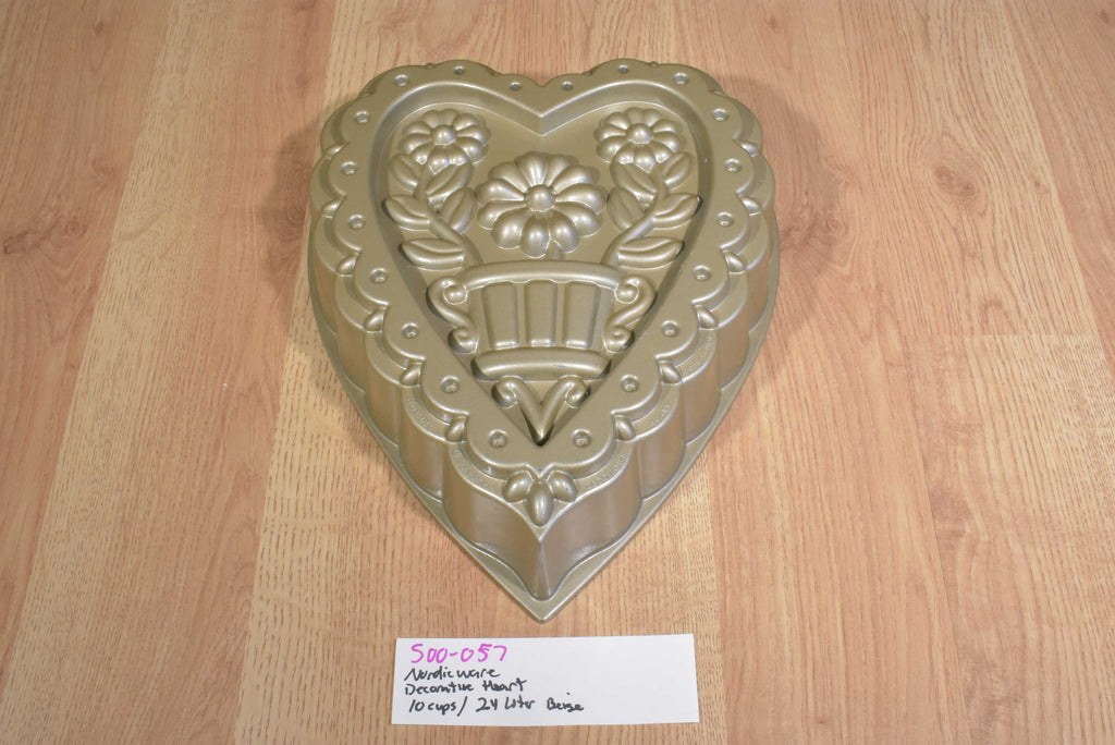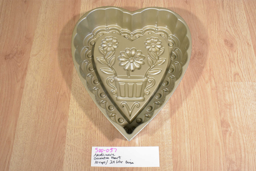 A gold colored heart shaped Nordic Ware cake pan with a pot of flowers.