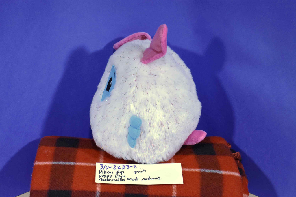 A sparkly white, blue, and pink Pikmi Pops puppy named Espi. It smells like marshmallow.