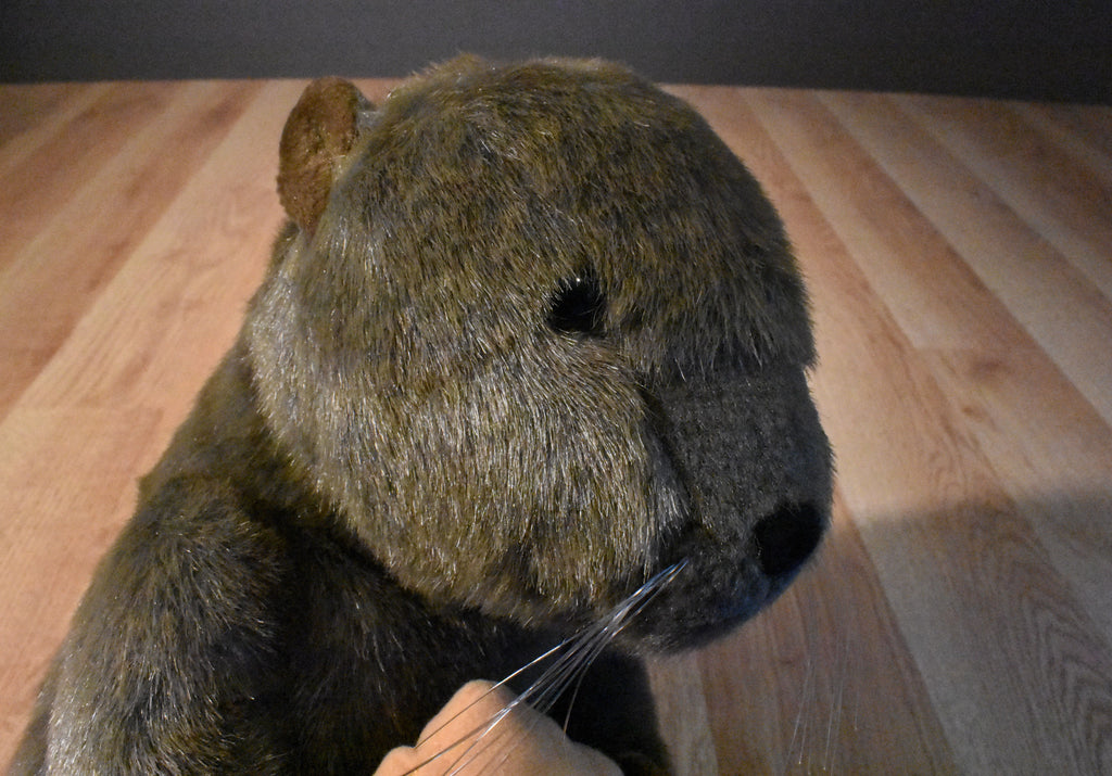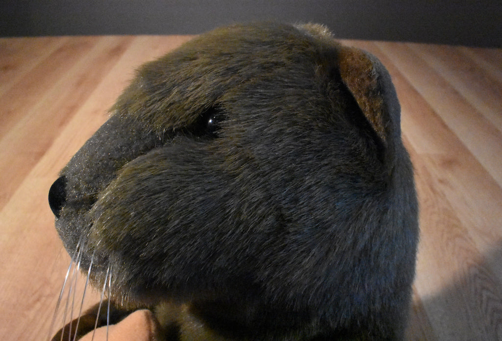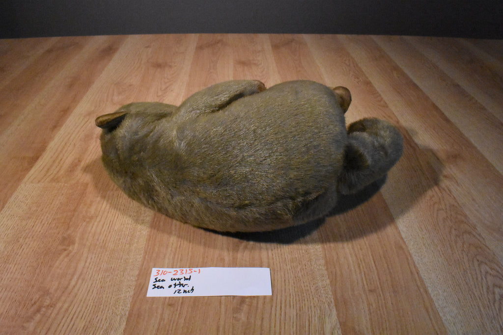 A brown Sea World Busch Gardens Sea Otter holding an orange clam.