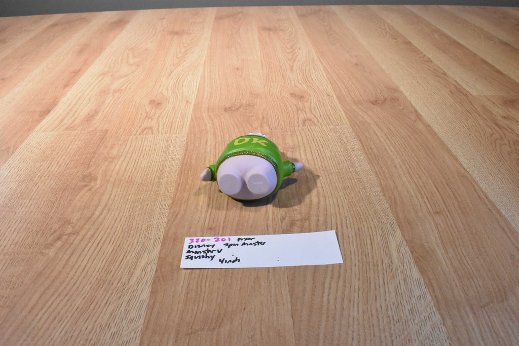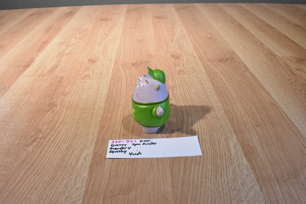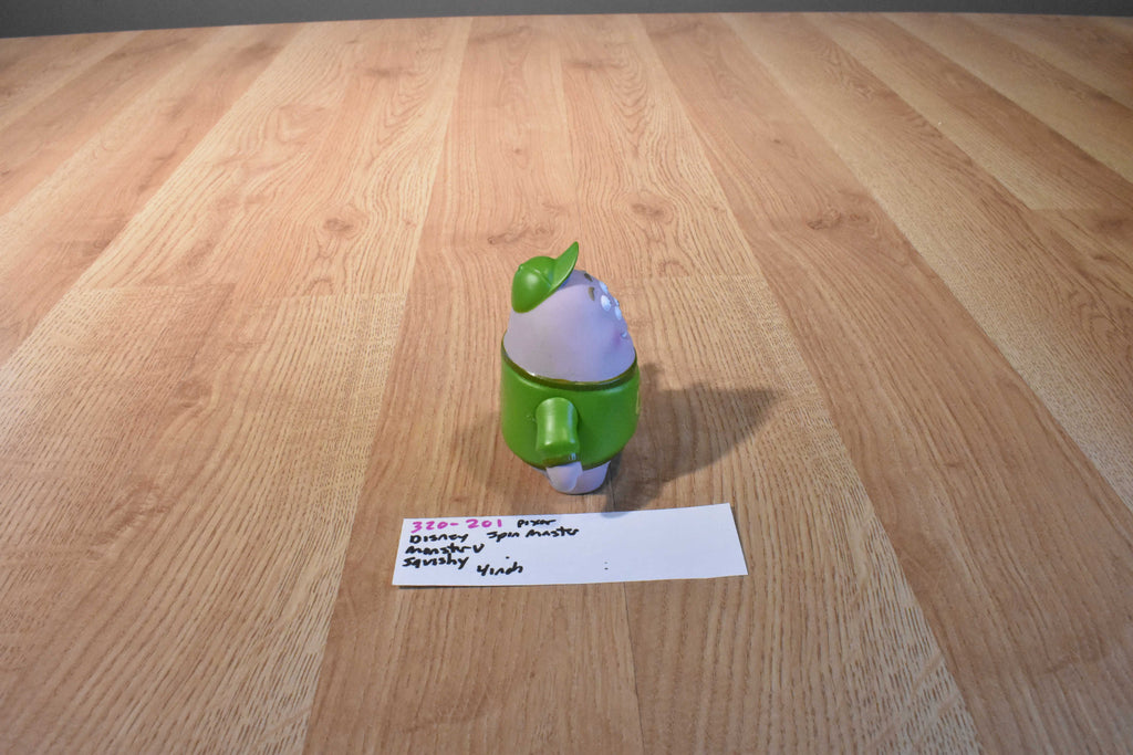 A Spin Master Disney Monsters U named Squishy. A purple monster with five eyes wearing a green shirt and hat shirt.