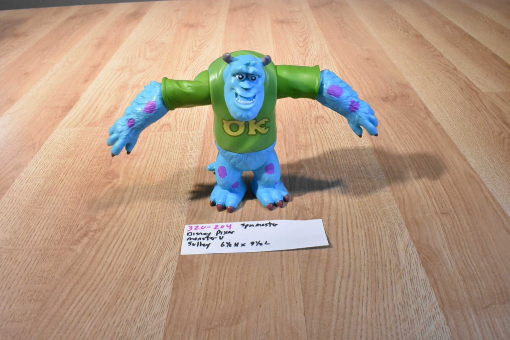 A Disney Monsters U named Sulley. A blue and purple spotted monster wearing a green shirt.