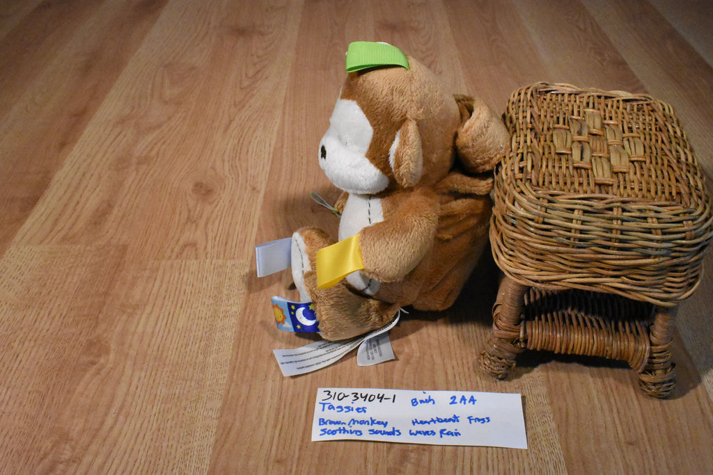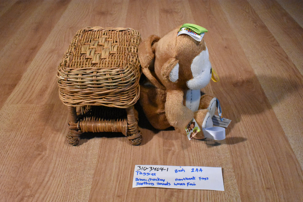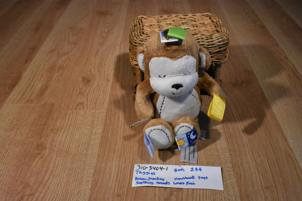 A sleeping brown Taggies monkey with tag loops. He makes soothing sounds of a heartbeat, waves, rain, and frogs.