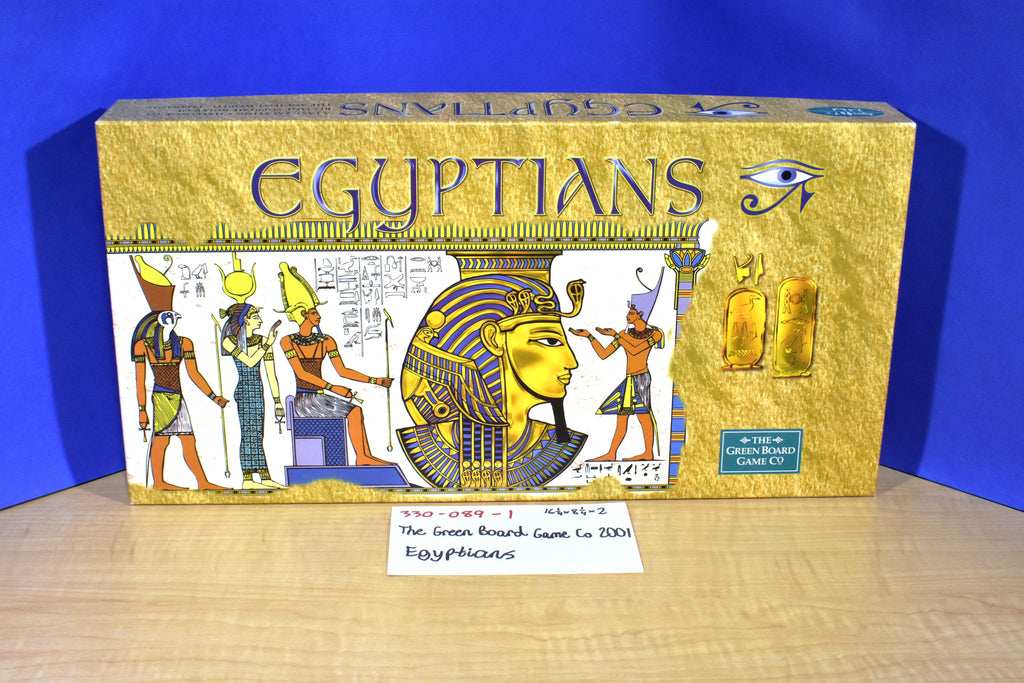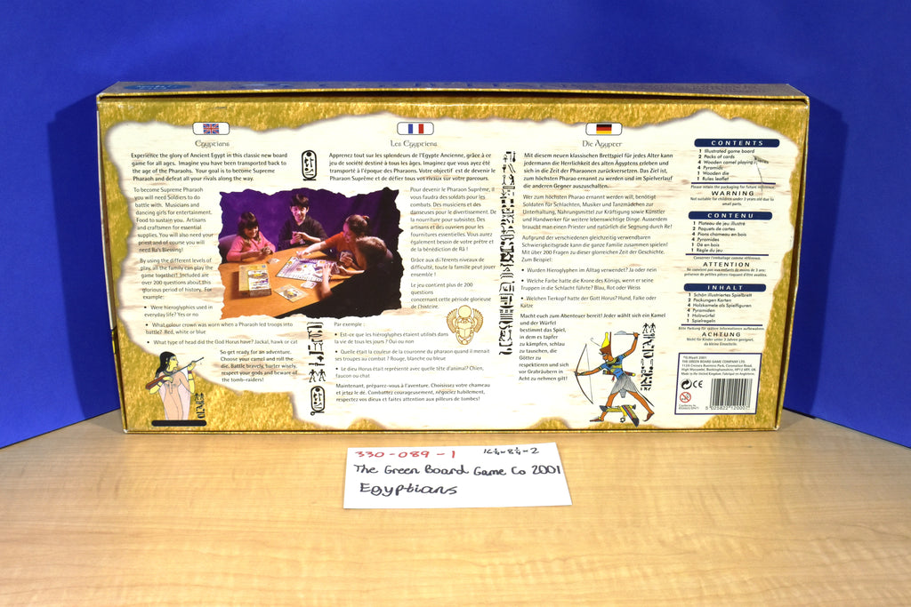 A Green Board Game 2 to 4 player board game where the player tries to become Supreme Pharaoh by collecting a full set of pharaoh cards and bringing them to their pyramid.