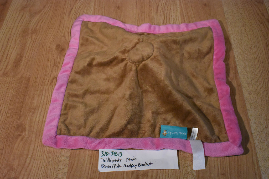 A brown and pink Tiddliwinks monkey security blanket with a pink bow.