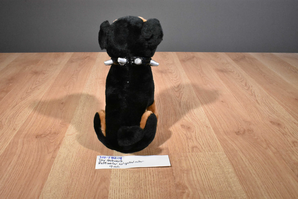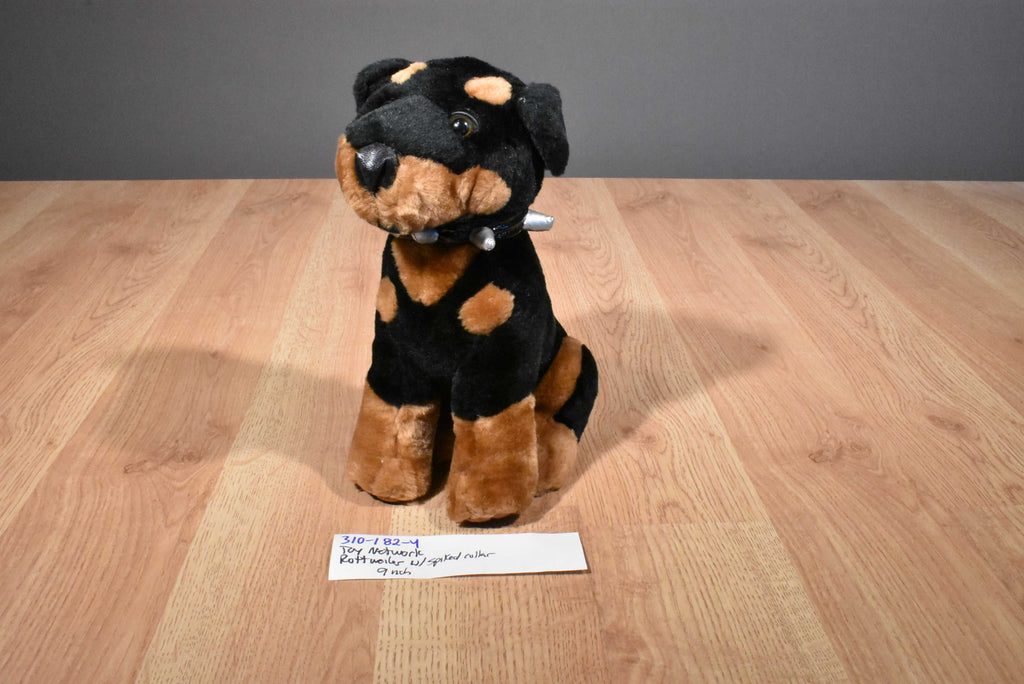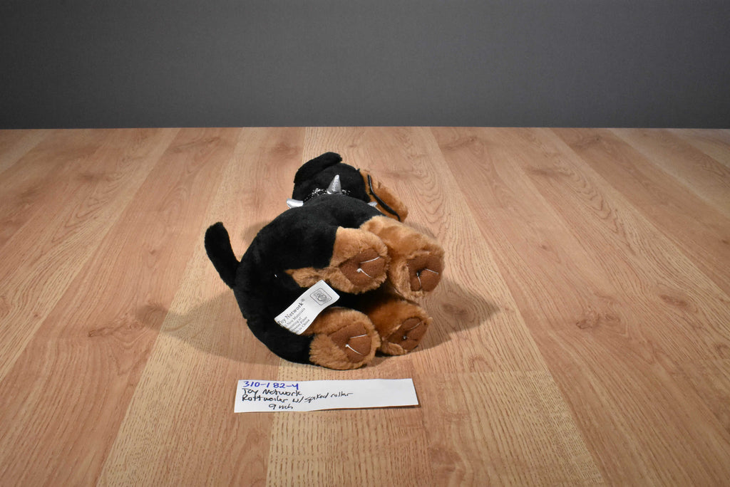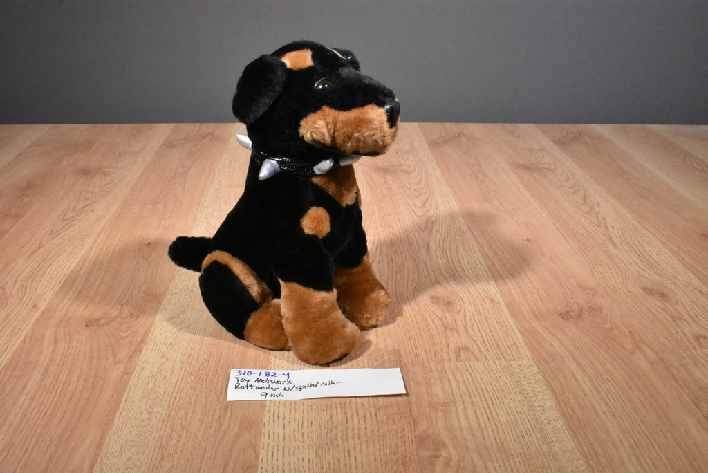 A black and brown sitting Toy Network Rottweiler dog wearing a spiked collar.