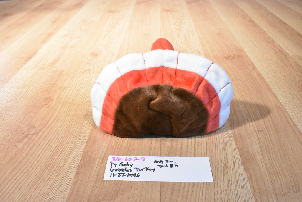 A brown, orange and white Ty Baby turkey named Gobbles.