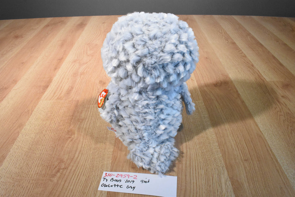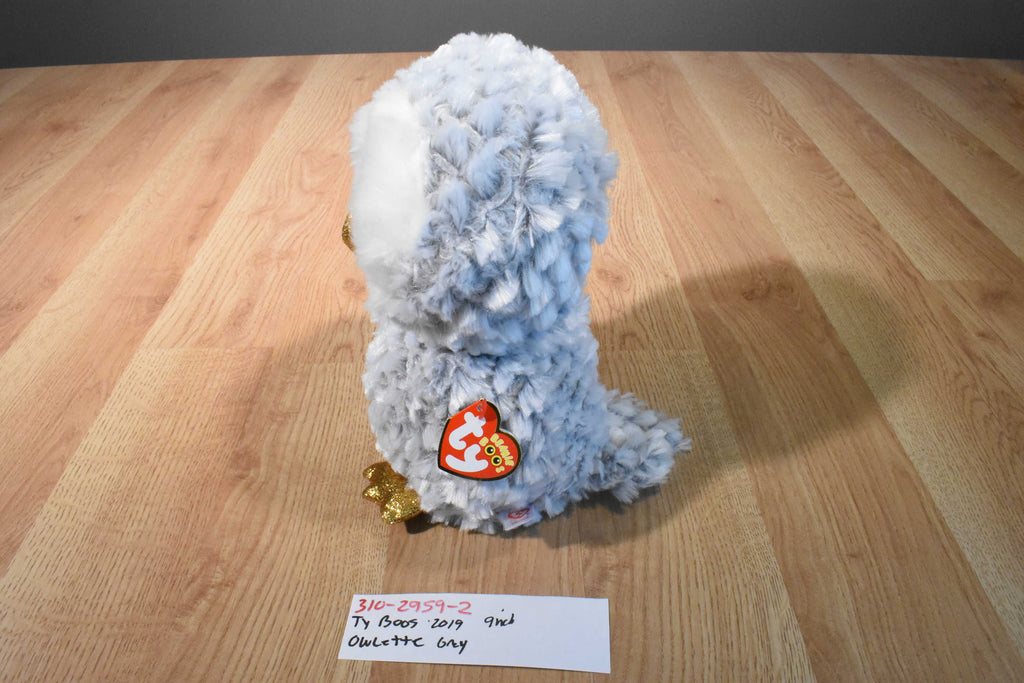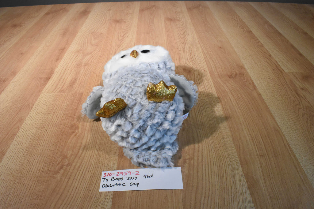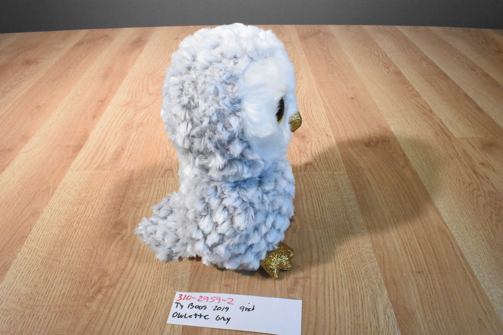 A grey and white Ty Beanie Boos owl with gold beak and feet named Owlette.