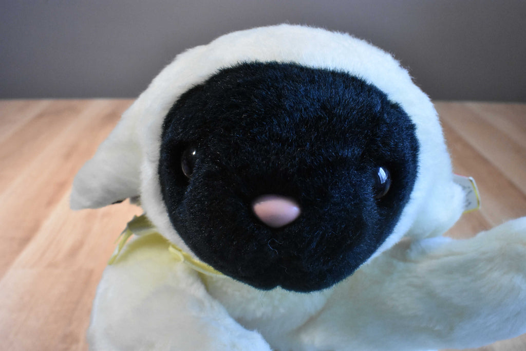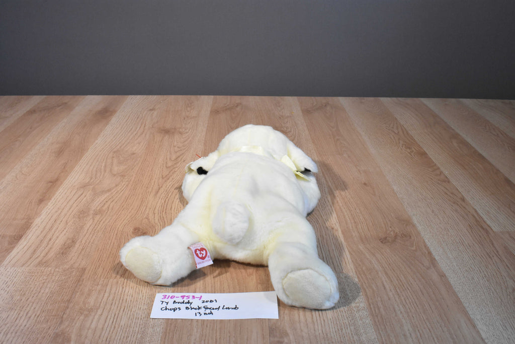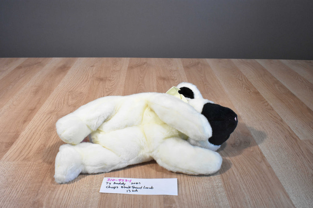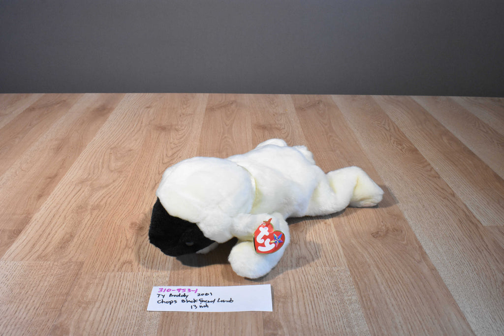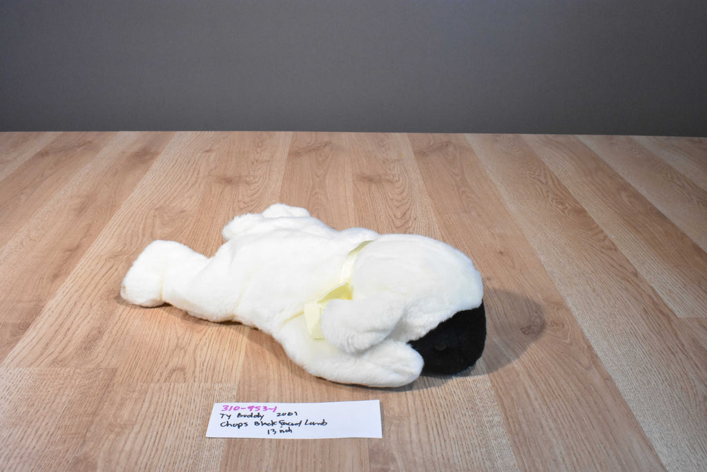 A laying beige and black faced Ty Beanie Buddies lamb named Chops wearing a yellow bow.