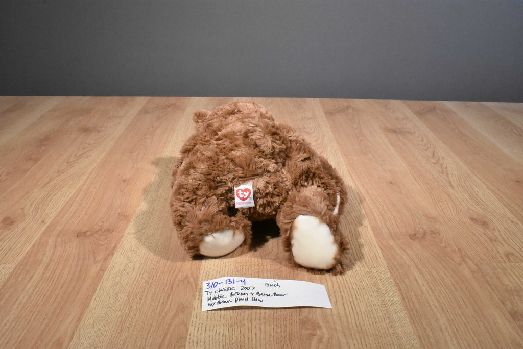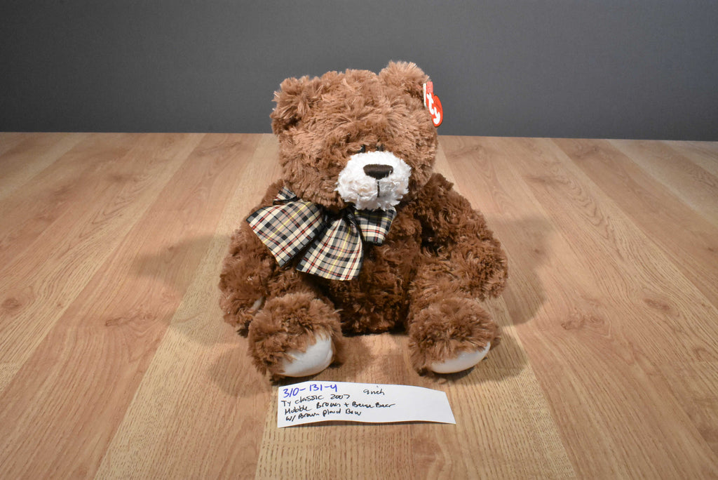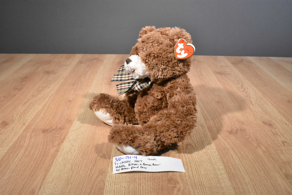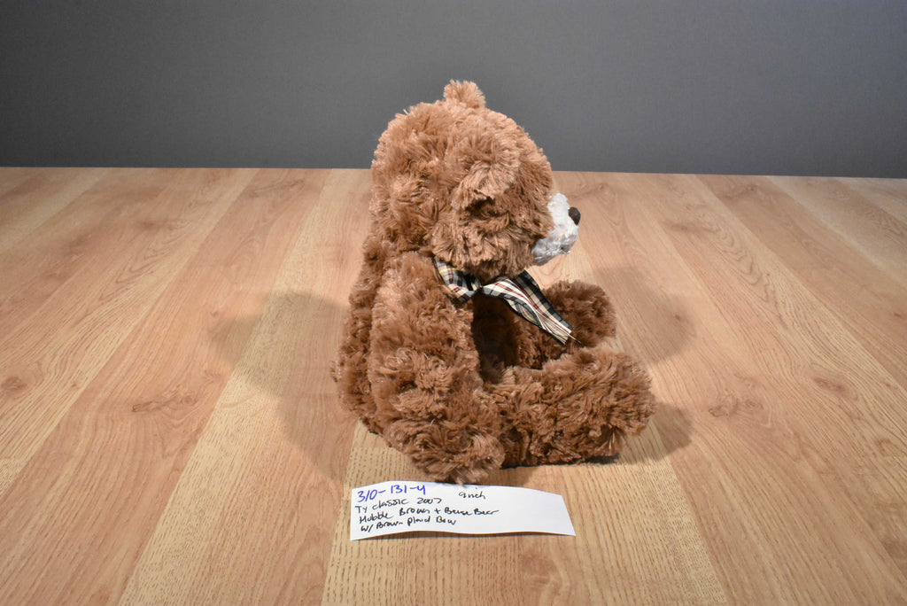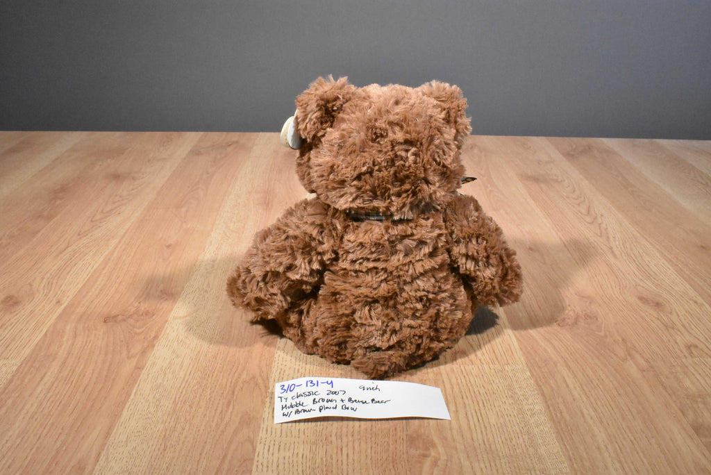 A brown and beige Ty Classic teddy bear named Hobble wearing a brown plaid bow.