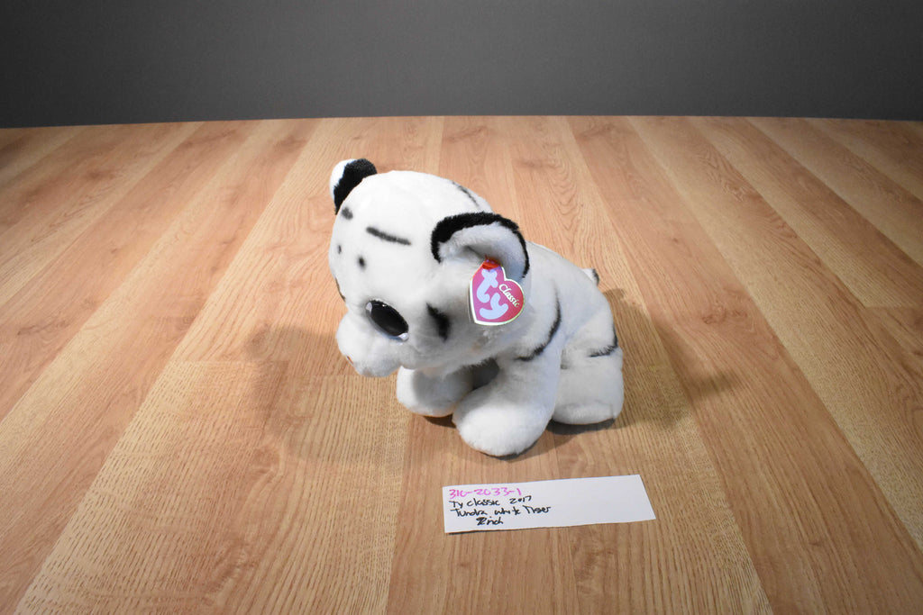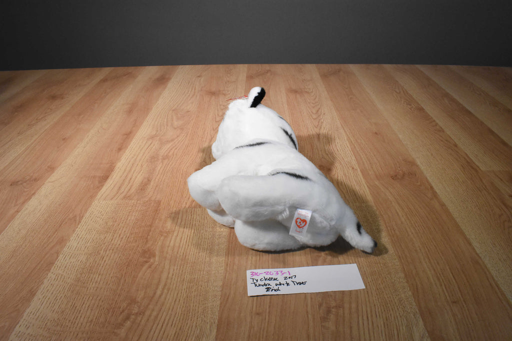 A sitting white and black striped Ty Classic tiger named Tundra.