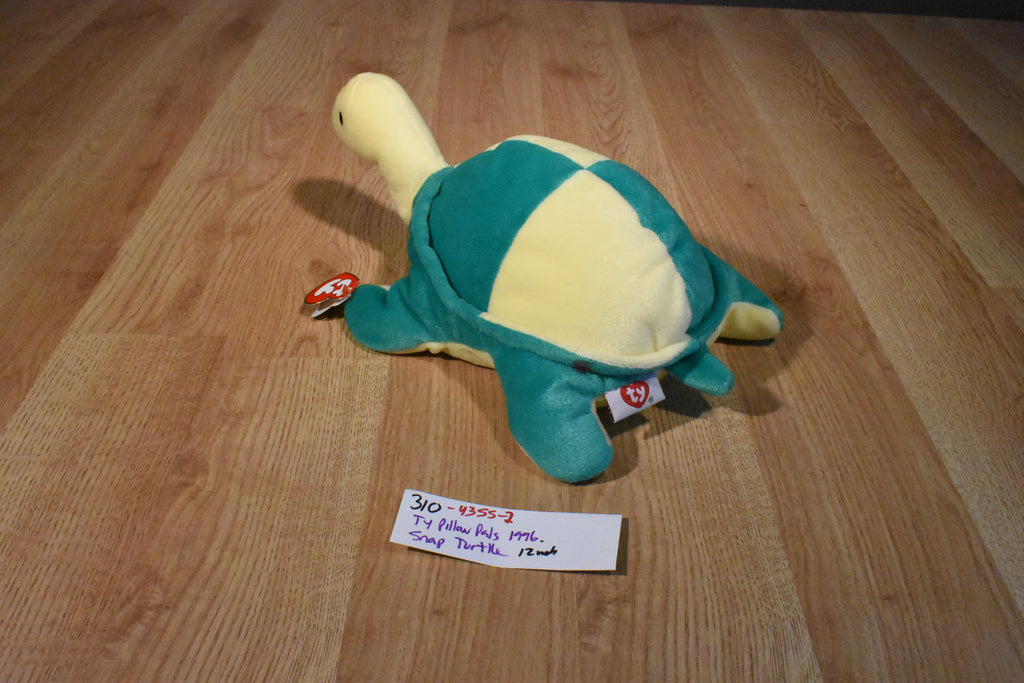 A green and yellow Ty Pillow Pals turtle named Snap.