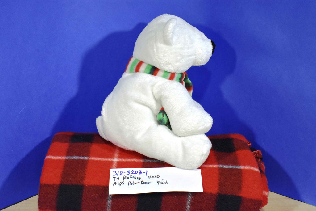 A sitting white Ty Pluffies polar bear named Alps wearing a red and green scarf.