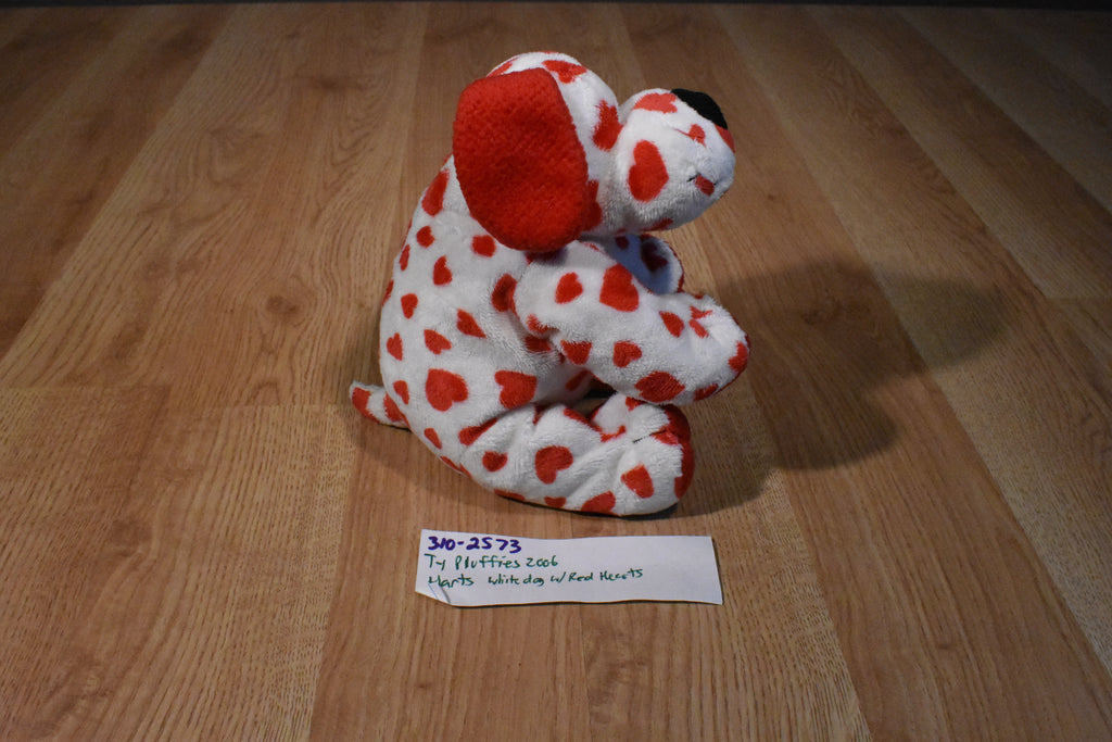 A white Ty Pluffies puppy dog with red heart named Harts.