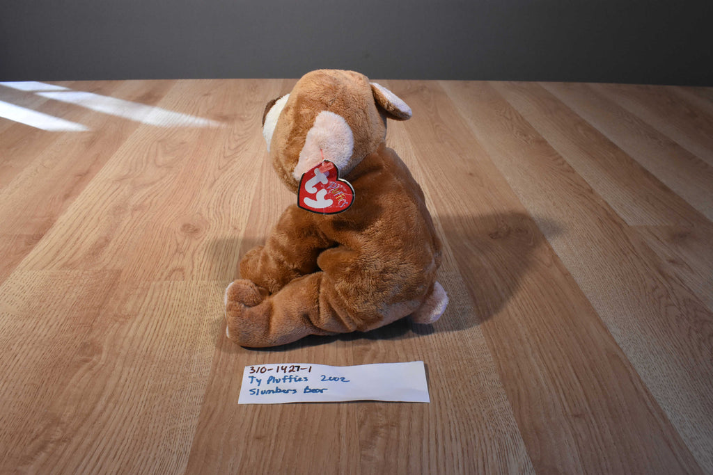 A brown and pink Ty Pluffies teddy bear named Slumbers.