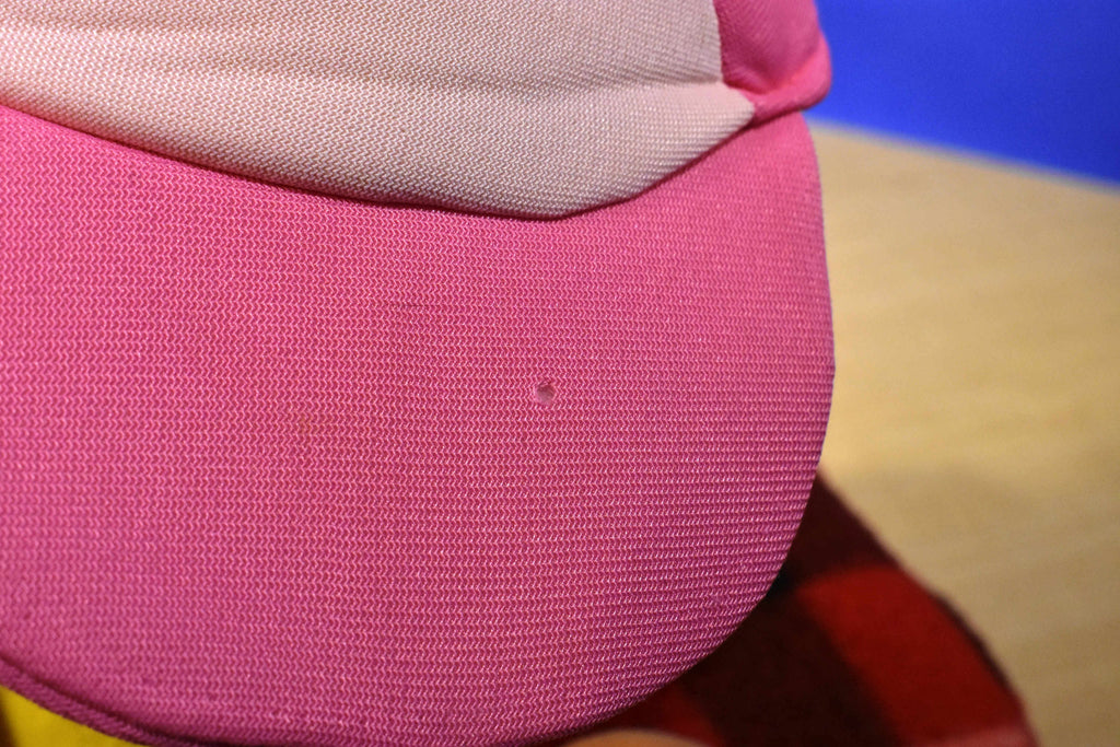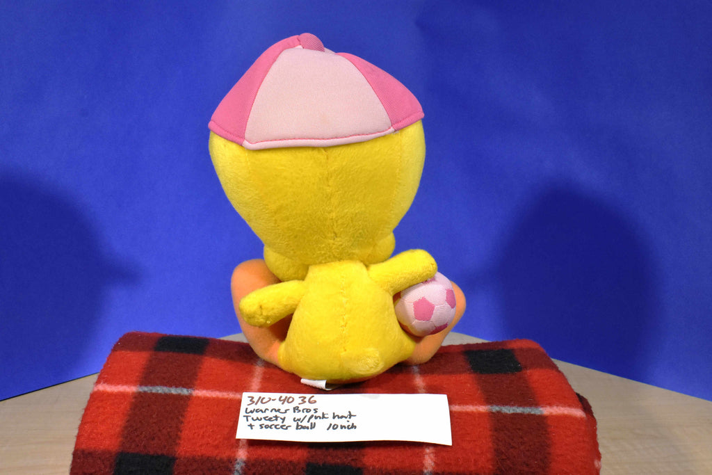 A yellow and orange Warner Bros. Tweety bird wearing a pink cap and holding a pink soccer ball.